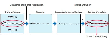 در جوشکاری فلز التراسونیک، ارتعاشات التراسونیک منجر به زدوده شدن لایه اکسیدی روی سطح فلزات در محل اتصال میشود و با نوسازی سطوح تماس، امکان ایجاد جوش حالت جامد التراسونیک از طریق جذب اتمی بین فلزات فراهم مینماید.