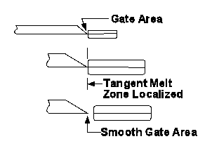 ناحیه گیت تزریق، شبیه گیت سوزنی باشد به گونهای که بتواند انرژی را در موقعیت تماس گیت با قطعه، متمرکز کند. در صورت عدم رعایت این اصل در طراحی، بخشی از گیت ممکن است بر روی قطعه باقی بماند.