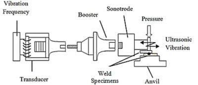 در فرآیند جوش فلزات به روش التراسونیک ، درحالی که دو سطح با اعمال فشار در کنار هم نگه داشته شدهاند ارتعاشات اولتراسونیک با ایجاد حرکت نسبی همراه با اصطکاک بین دو سطح تماسی باعث تولید گرما و بدنبال آن رسیدن سطوح به 30 تا 80 درصد دمای نقطه ذوب میشوند و به اینصورت سطوح یا قطعات در حال تماس به همدیگر جوش داده میشوند. این فرآیند یک فرآیند بدون تغییر فاز است و فلزات بدون آنکه ذوب شوند در حالت جامد به هم متصل میشوند. منبع تغذیه التراسونیک جریان متناوب شهری را به جریان با ولتاژ و فرکانس مناسب میرساند. این فرکانس میتواند بین 15 تا 40 کیلوهرتز باشد. ترنسدیوسر یا کانورتر التراسونیک به وسیله پیزوالکتریک ها انرژی الکتریکی را به انرژی مکانیکی تبدیل میکند. در واقع سیگنالهای الکتریکی به ارتعاشات مکانیکی تبدیل میشوند و سپس این ارتعاشات توسط بوستر تقویت شده و به وسیله هورن یا سونوترود به قطعات انتقال داده میشوند.